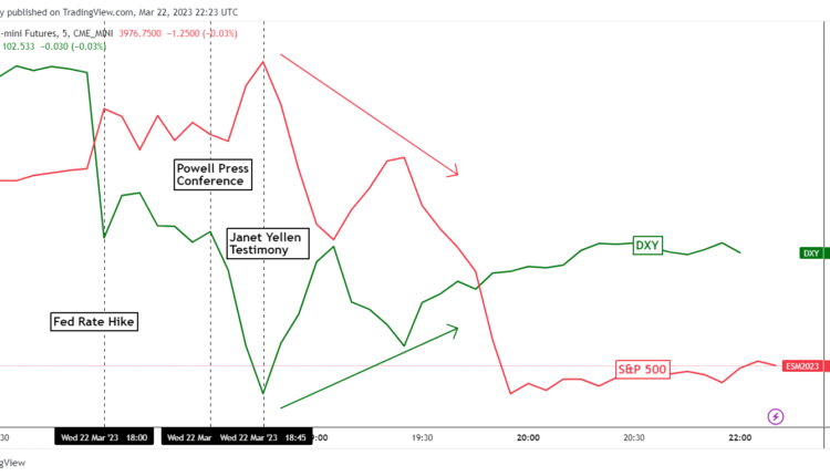 She noted that the government is not looking at offering “blanket” deposit insurance to stabilize the banking sector. This amplified selling pressure in regional banks, with First Republic Bank down over 15% by the end of the day. In the chart below, you can get a better idea of how price action evolved throughout these events and how the S&P 500 reversed and the US Dollar bottomed.