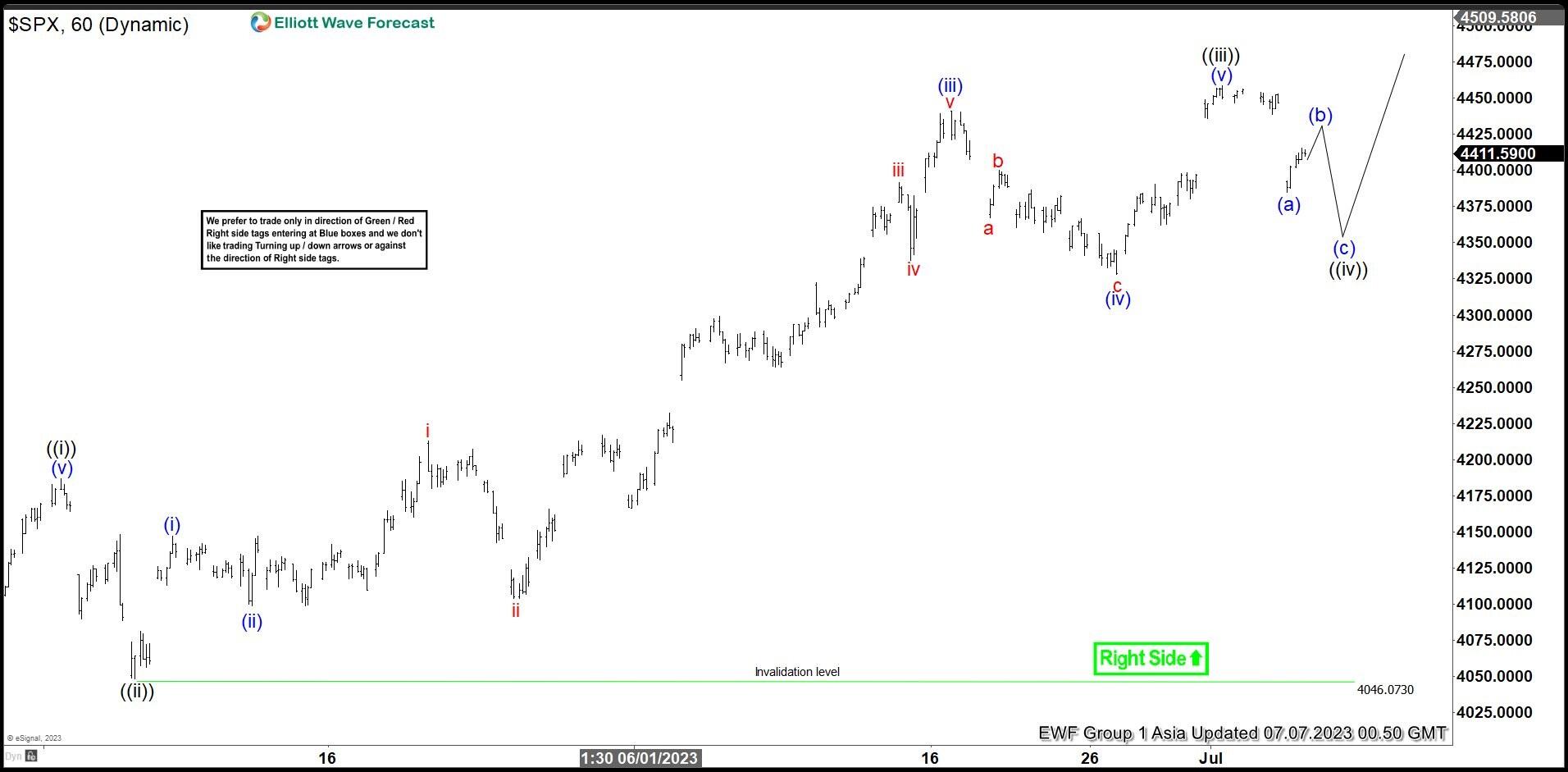 Short term Elliott Wave view in S&P 500 (SPX) suggests that the rally from 3.13.2023 low is unfolding as a 5 waves impulse structure. Up from 3.13.2023 low, wave ((i)) ended at 4186.92. Dips in wave ((ii)) ended at 4046.07 as the 60 minutes chart below shows. Up from there, wave (i) ended at 4147.02 and pullback in wave (ii) ended at 4098.92. Index extends higher in wave (iii) towards 4441.2 and dips in wave (iv) ended at 4328.08.