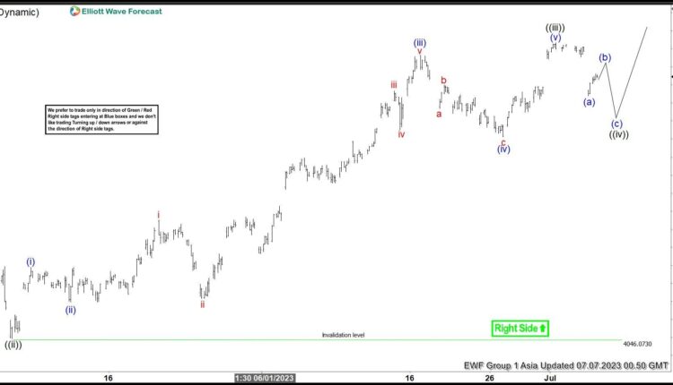 Final leg higher wave (v) ended at 4458.48 which completed wave ((iii)). Pullback in wave ((iv)) is in progress to correct cycle from 5.4.2023 low in 3, 7, or 11 swing. Down from wave ((iii)), wave (a) ended at 4385.05. Expect wave (b) rally to fail below 4458.48 and the Index to turn lower in wave (c) before it completes wave ((iv)) and resumes higher. Wave ((iv)) typically ends somewhere at the 23.6 – 38.2% Fibonacci retracement of wave ((iii)). That area is at 4301.2 – 4361.1. From here, the Index can find buyers for further upside. Near term, as far as pivot at 4046.07 low stays intact, expect pullback to find support in 3, 7, or 11 swing for further upside.