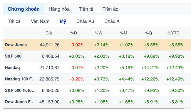 Kết thúc phiên giao dịch ngày 14/08, chỉ số S&P 500 nhích 0.03% lên 6,468.54 điểm. Đà tăng vào cuối phiên giúp S&P 500 ghi nhận phiên tăng thứ 3 liên tiếp với biên độ rất hẹp. Chỉ số Nasdaq Composite và Dow Jones giảm nhẹ, với Nasdaq Composite hạ 0.01% xuống 21,710.67 và Dow Jones mất 11.01 điểm (tương đương 0.02%) xuống 44,911.26 điểm.