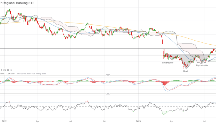 The economic calendar today may be relatively quiet, which could drive a more subdued session to end the week. Perhaps one to watch may be the SPDR S&P Regional Banking ETF. Having validated an inverse head-and-shoulder formation in July last month, recent weakness has brought the index back to retest its neckline at the 44.75 level, which will require strong defending from buyers ahead. Failure to hold above the level may pave the way to retest the 40.00 level next, while immediate resistance for now will stand at its recent tops at the 49.40 level.