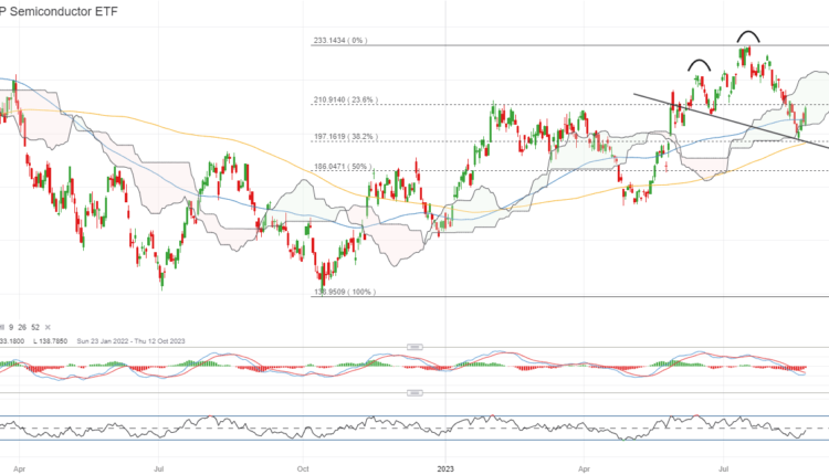 Perhaps one to watch may be the SPDR S&P Semiconductor ETF, which has seen a bounce off a support confluence lately (Ichimoku cloud support, 38.2% Fibonacci level). The February 2023 high at the 210.90 level will be an immediate resistance to overcome ahead, in order to pave the way to retest the 222.64 level next. A strong positive follow-through may be needed however, given that any turn lower could still run the risks of a potential head-and-shoulder formation.