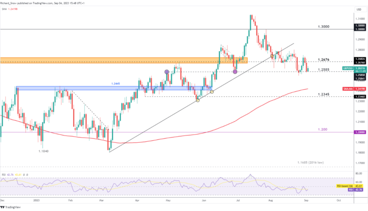 GBP/USD looks to have found support at 1.2585 – a level that provided a pivot point in April and June (highlighted in purple). With prices trading above the 200-day simple moving average, levels to the upside remain constructive. Once such level is 1.2676. Support lies at 1.2585 and the 200 SMA which appears around 1.2420.