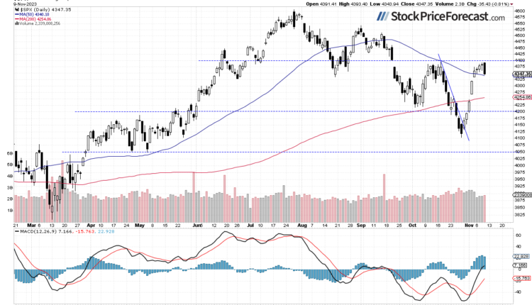 The S&P 500 index lost 0.81% on Thursday as it bounced from 4,400 level. Stocks retraced some of their recent advances following 30y bond auction results, Jerome Powell’s speech, among other factors. Yesterday’s daily low was at 4,343.94 and earlier in the day the S&P 500 reached new local high of 4,393.40. It was very close to mid-October high of 4,393.57. Investors’ sentiment remains positive despite a lot of uncertainty about monetary policy, economic growth and geopolitics. Last week the index rallied from October 27 local low of 4,103.78.