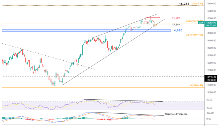 The DAX appears to have pulled back after retesting and failing to close above 15,660 as the index tests 15,246 – the recent low. The level coincides with trendline support. A gauge for a deeper pullback is the 14,980 zone of support (blue), followed by the 61.8% Fibonacci retracement of the 2022 major move. Bullish continuation can be assessed in the event price action breaks and closes above 15,660 with an eye on 16,285.