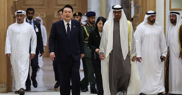 Tổng thống Hàn Quốc Yoon Suk Yeol (trái) đi cùng Tổng thống UAE Mohamed bin Zayed Al Nahyan (phải) tới địa điểm tổ chức hội nghị thượng đỉnh tại dinh tổng thống Qasr Al Watan ở Abu Dhabi vào ngày 15/1/2023. Ảnh: Yonhap