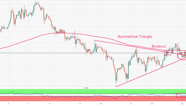 USD/CAD tests the breakout region of the Symmetrical Triangle chart pattern formed on a two-hour scale. A breakout of the aforementioned chart pattern results in wider ticks and heavy buying volume. The broader trend is still bearish as the asset is trading below the 200-day Exponential Moving Average (EMA), which trades around 1.3512.