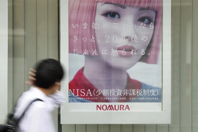 Một quảng cáo về Tài khoản Tiết kiệm Cá nhân Nippon (NISA) được trưng bày tại một chi nhánh của Công ty Chứng khoán Nomura ở khu vực Kichijoji, Tokyo ngày 22/04 – Ảnh: Kiyoshi Ota/Bloomberg