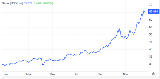 Tính tới ngày 19/12, giá bạc lập kỷ lục 66 USD/oz, tức tăng gần 130% so với đầu năm và là kim loại quý tăng mạnh nhất trong năm nay.