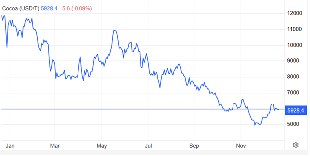Ở chiều ngược lại, giá cacao lao dốc mạnh nhất trong năm 2025, với mức giảm gần 50% so với đầu năm.