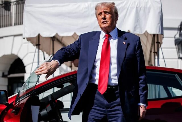 Trong một sự kiện tại Nhà Trắng hồi tháng 3, Tổng thống Donald Trump xuất hiện bên một chiếc Tesla – Ảnh: Samuel Corum/Sipa