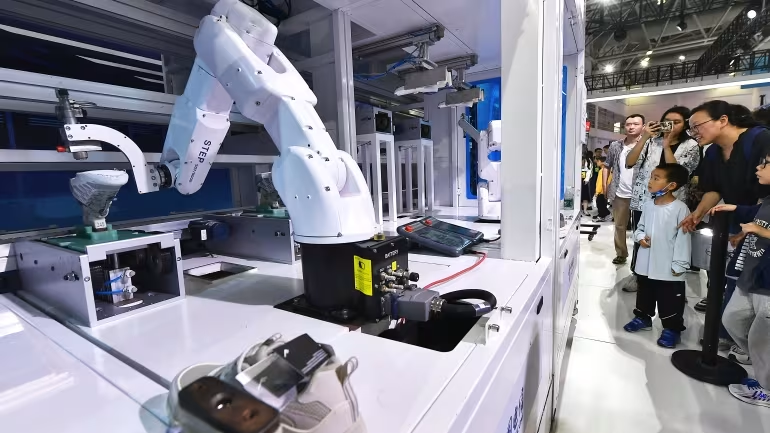 Du khách quan sát robot sản xuất giày trên dây chuyền sản xuất tại một triển lãm ở Phúc Châu, tỉnh Phúc Kiến, Trung Quốc.