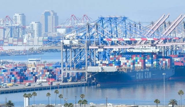 Hoạt động tại cảng hàng hóa Long Beach ở California, Mỹ. (Ảnh: AFP/TTXVN)