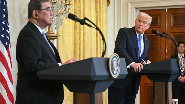 Tổng thống Mỹ Donald Trump (phải) và Thủ tướng Nhật Bản Shigeru Ishiba trong cuộc họp báo chung tại Nhà Trắng ở Washington, DC, ngày 07/02/2025