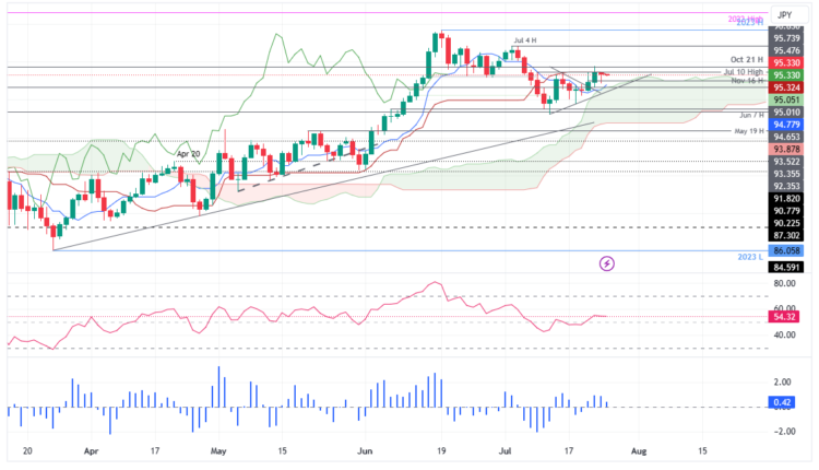 - AUD/JPY trendline suggests a neutral to downward bias as the pair struggles to break the Kijun-Sen line at 95.32.