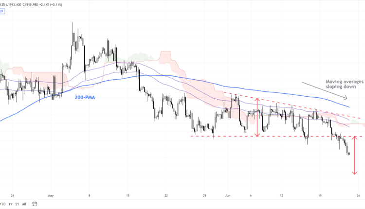 A large part of the current weakness seems to be a spillover effect of what’s happening on higher timeframe charts, as highlighted in recent months. See “Gold Could Find It Tough to Crack $2000”,published March 28, and “Gold Weekly Forecast: Is it Time to Turn Cautious on XAU/USD?” published April 16. Subsequent updates can be found here:April 24,May 10,May 17, May 31, and June 8.