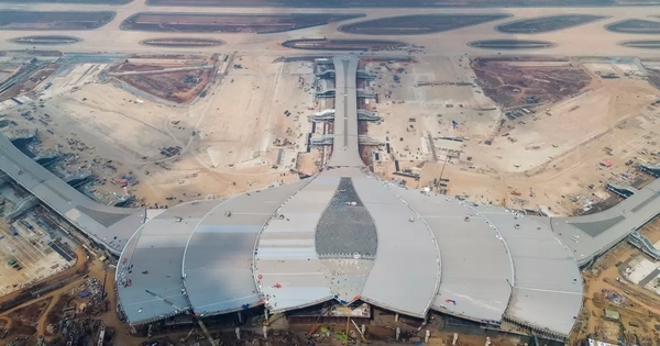 Từ trên cao, nhà ga hành khách Cảng hàng không quốc tế Long Thành đã rõ nét như cánh hoa sen. Đây là công trình được xem là “trái tim” của dự án sân bay Long Thành.