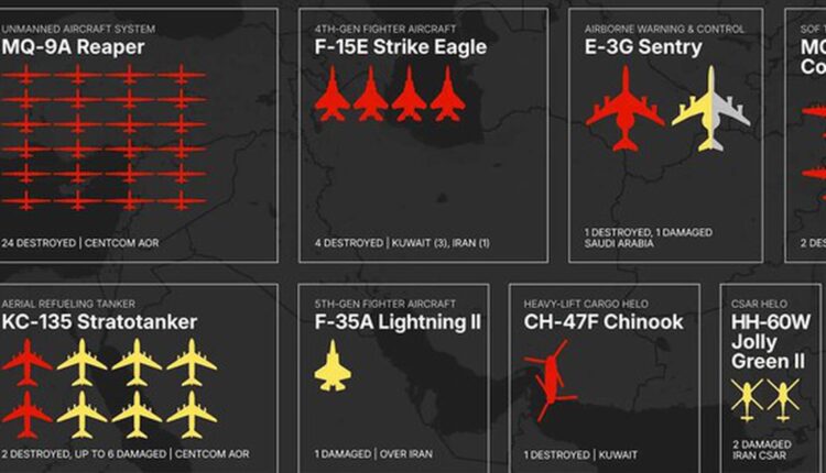 Trong số máy bay Mỹ bị phá huỷ hoàn toàn có chiếc E-3G Sentry trị giá tới 500 triệu USD. Đây là dòng máy bay cảnh báo sớm và chỉ huy trên không, đóng vai trò quan trọng trong giám sát chiến trường và điều phối tác chiến quy mô lớn.