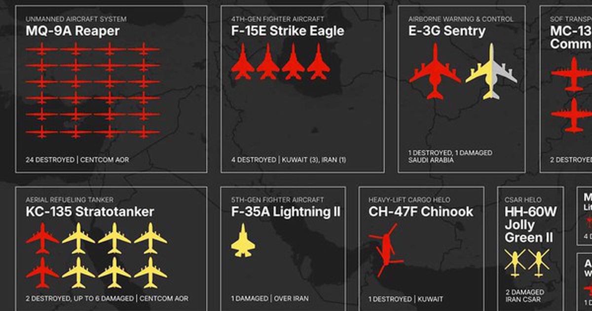 Toàn cảnh tổn thất máy bay Mỹ trong Chiến dịch “Cuồng nộ kinh hoàng” tại Iran kể từ ngày 28-2. Ảnh: TWZ