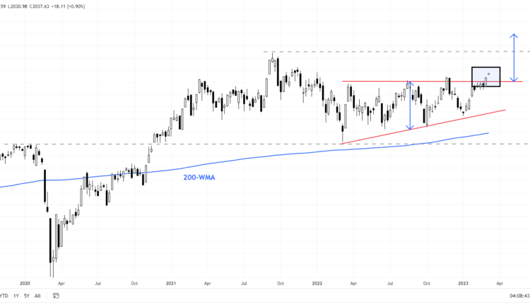 Monday’s jump appears to be triggering a break out from the ascending triangle, near the top end of the channel. It might be prudent to wait for a crack in the channel ceiling before concluding the bullish break. Such a break could open the way toward 2200 (around 8% from Monday’s close). On the downside, the index needs to hold above the immediate cushion at the early-February low of 1961 for the bullish pressure to remain intact.