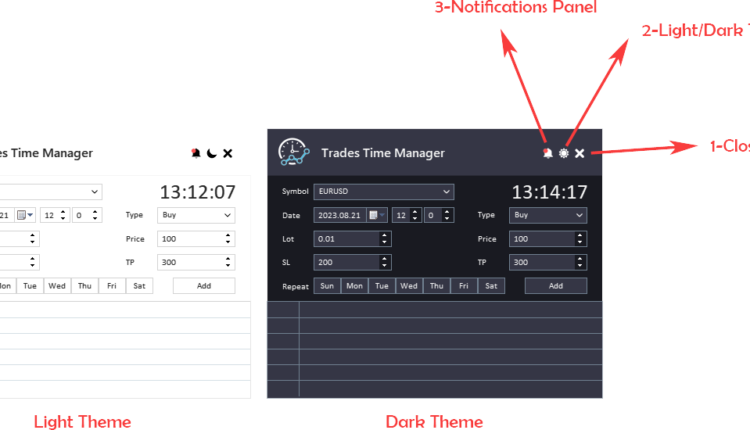 Additionally, the Trades Time Manager's visual customization allows you to personalize your trading experience. Toggle the Dark Theme option to reduce eye strain during extended trading sessions, enhancing your overall trading environment.