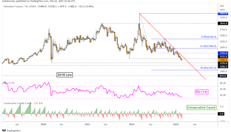 Zooming in further on the 4-hour chart reveals an increasingly bearish perspective. Palladium has broken under an Ascending Triangle chart formation. This could open the door to resuming losses that accelerated at the beginning of February. Immediate support is the 23.6% Fibonacci extension level at 1462.5. Breaking lower places the focus on 1413.5.