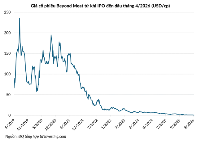Từng được định giá hơn 12 tỷ USD và là một trong những đợt IPO thành công nhất năm 2019, Beyond Meat chỉ còn vốn hóa khoảng 270 triệu USD vào đầu tháng 4/2026.