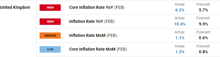Headline UK inflation broke a three-month trend and rose in February, rising to 10.4% y/y compared to 10.1% y/y in January and market expectations of 9.9%. Core inflation also rose sharply to 6.2% from 5.8% and half-a-point above market forecasts.