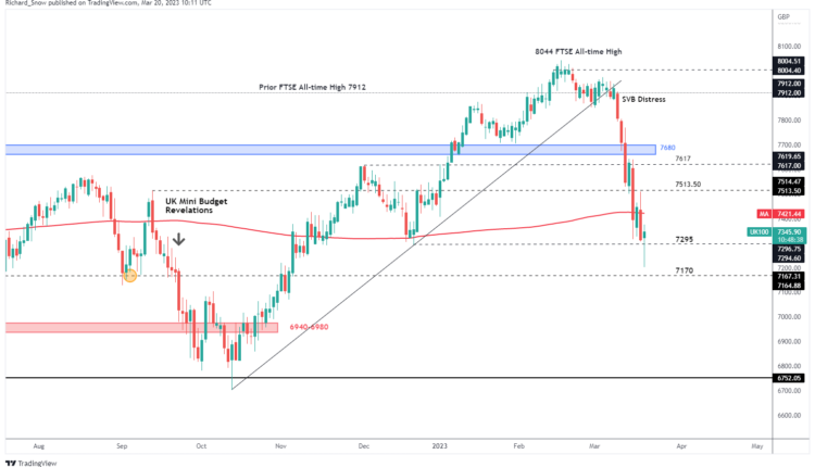 The FTSE 100 index has come under pressure in the wake of the multiple midsized bank failures in the US, and, not to mention, the inevitable sale of the beleaguered Credit Suisse. The index outperformed other major indices towards the latter stages of 2022 and the early trading weeks of 2023 but the direction of travel has not only changed, but it has changed rather quickly.