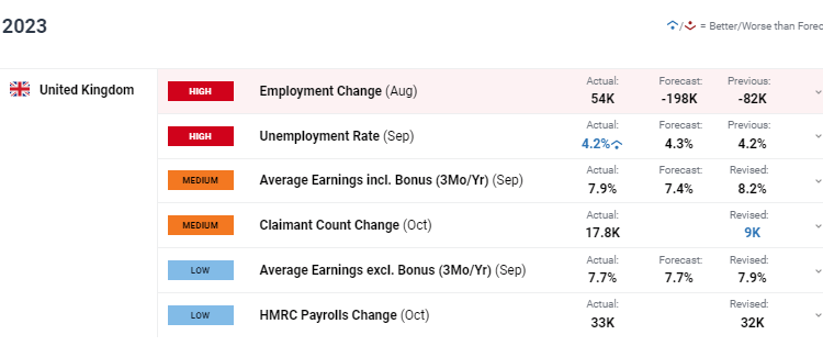 The British pound found support after UK labor data (see economic calendar below) showed signs of resilience in the face of a tight monetary policy environment. Unemployment missed estimates while average earnings including bonuses beat forecasts; possibly contributing to upside inflation concerns. Headline employment change supplemented a tight labor market narrative by moving back into positive territory for the first time since April this year.