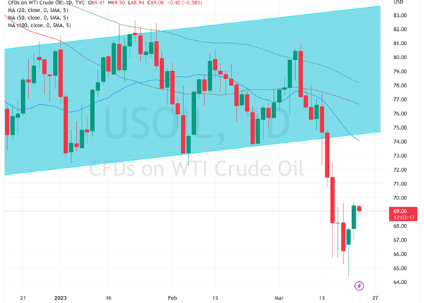The banking-related falls of the past week took prices well below the well-respected uptrend channel which had previously been solidly in place since early December 2022. This channel.