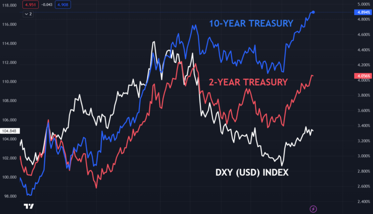 DXY INDEX AGAINST TREASURY 2- AND 10-YEAR YIELDS