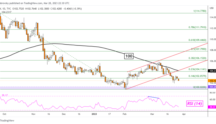On the daily chart, the DXY index continues to make downside progress after breaking under a rising channel. The currency is testing lows set last week, which will be interesting to watch. Arguably, the more important support zone to watch will be February lows (100.82 – 101.29). As such, there is room in the near term to continue the bearish trajectory without offering an increasing downside technical bias. Key resistance seems to be the 100-day Simple Moving Average (SMA).