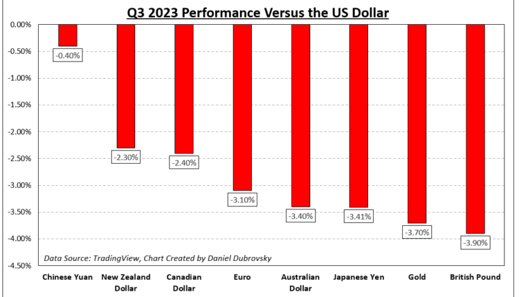 The US Dollar broadly outperformed against its major counterparts in the third quarter of 2023. Relatively speaking, it performed the best against the British Pound, Japanese Yen and Australian Dollar. Meanwhile, the Chinese Yuan fared better.