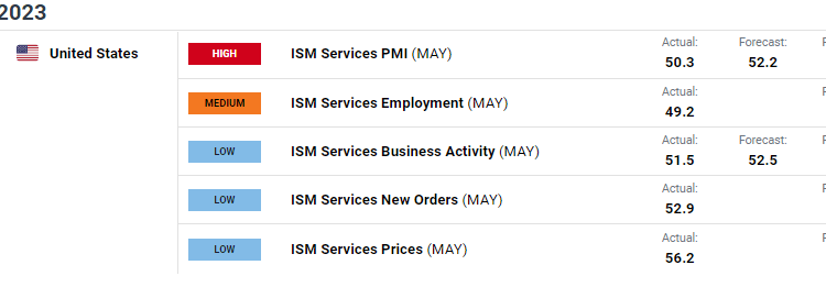 - U.S. ISM Services PMI falls to 50.3 in May from 51.9 previously, well below expectations