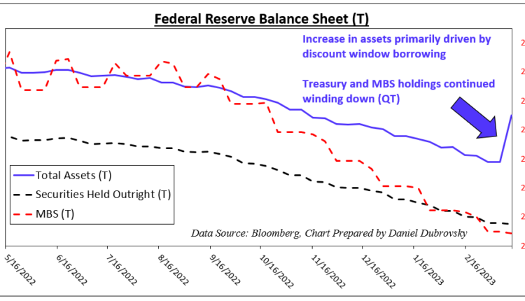 Meanwhile, it was revealed that the Fed’s balance sheet swelled by an impressive 300 billion. Make no mistake, this is not quantitative easing. On the chart below, you can see that while overall holdings rose, securities held outright (mostly Treasuries) and mortgage-backed securities (MBS) continued shrinking as one would expect under quantitative tightening.