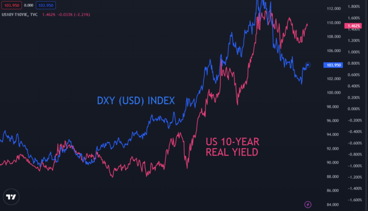 DXY (USD) INDEX AGAINST US 10-YEAR REAL YIELD