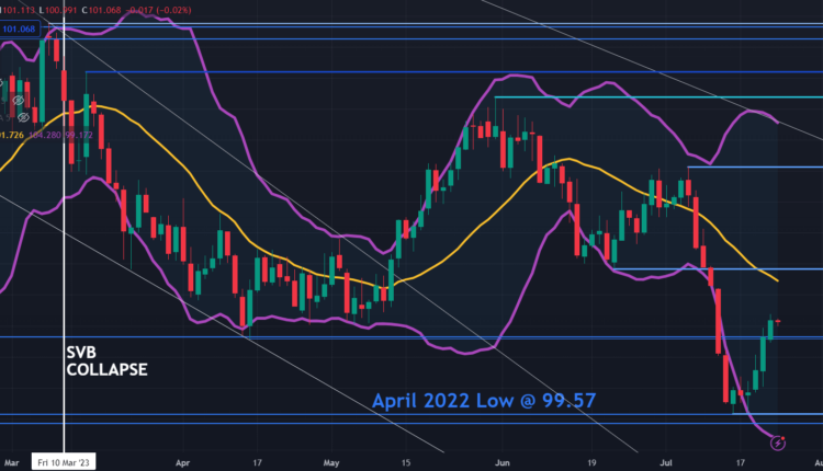 The DXY (USD) index made a 15-month low 10 days ago at 99.58 which was just above the April 2022 low of 99.57.