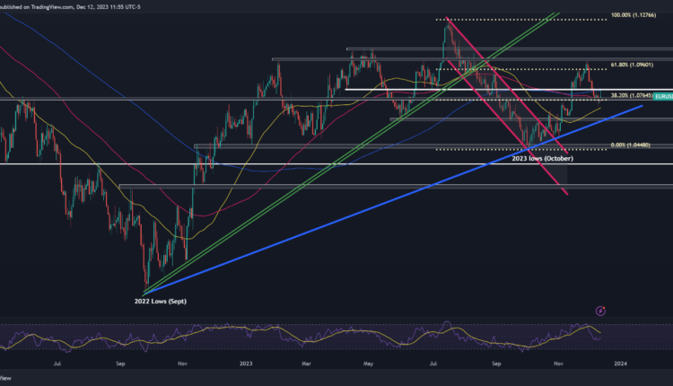 EUR/USD exploded higher in November, but has weakened moderately this month, with the exchange rate settling below its 200-day simple moving average in recent days– a bearish technical signal. If the pullback extends, a potential retest of the 50-day SMA could materialize soon. Continued weakness might draw focus towards trendline support, currently traversing the 1.0640 region.