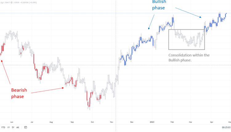 Note: In the above colour-coded chart, Blue candles represent a Bullish phase. Red candles represent a Bearish phase. Grey candles serve as Consolidation phases (within a Bullish or a Bearish phase), but sometimes they tend to form at the end of a trend. Note: Candle colors are not predictive – they merely state what the current trend is. Indeed, the candle color can change in the next bar. False patterns can occur around the 200-period moving average, or around a support/resistance and/or in sideways/choppy market. The author does not guarantee the accuracy of the information. Past performance is not indicative of future performance. Users of the information do so at their own risk.