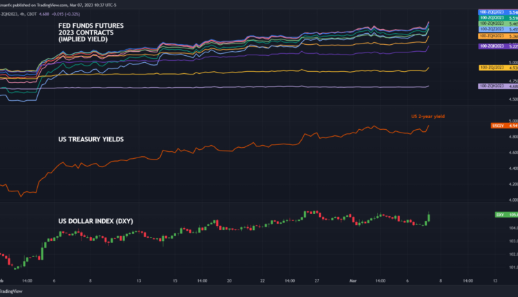 - The Fed chairman embraces a hawkish stance and indicates that the FOMC terminal rate will likely be higher than initially anticipated