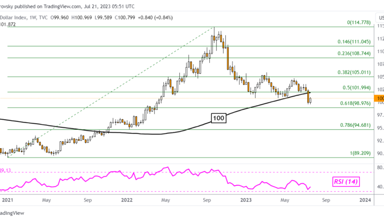The DXY Dollar index fell about 2.3% last week, marking the worst 5-day period since November. Using the weekly setting below, we can get an idea of how prices have behaved since then heading into the end of July. Prices broke under the 100-week Simple Moving Average (SMA). That has opened the door to a broader bearish shift.