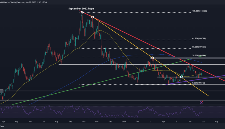 After its recent rebound, the US dollar (DXY) is steadily approaching medium-term trendline resistance at 103.50. While bulls may have a hard time pushing prices above this technical barrier, a breakout could lure new buyers into the market, setting the stage for a move toward 104.70, near the May swing highs.