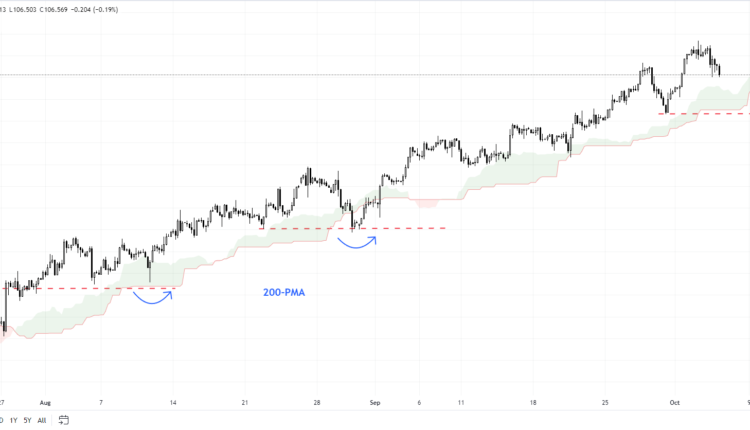 The DXY Index’s (US dollar index) fall below minor support at last week’s high of 106.85 indicates that the upward pressure has faded a bit. However, this wouldn’t imply that the uptrend is reversing – indeed, the index would need to break below quite strong support at Friday’s low of 105.65, coinciding with the lower edge of the Ichimoku cloud on the 240-minute charts.