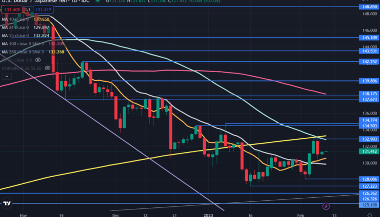 USD/JPY has been in a 127.22 – 134.77 range for seven weeks. The 55- and 260-day simple moving averages (SMA) are just above the price while 10- and 21-day SMAs lie below it.