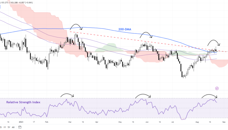 On technical charts, the DXY Index (USD index) has been struggling to clear above a stiff barrier on the 200-day moving average and a downtrend line from early 2023. Back-to-back doji / small body candles in recent days coupled with an inverted hammer on Wednesday raise the odds that the USD rally could be about to stall. Zooming on to the hourly charts, any break below the immediate converged floor at 102.50-1.0300, including the 89-period moving average and the lower edge of the Ichimoku cloud on the 240-minute charts would confirm that the upward pressure had faded.