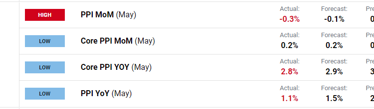 Month on month PPI for May dropped to -0.3% after consensus of a 0.1% drop had initially been forecasted. Year-on-year PPI dropped significantly, from 2.3% to 1.1% while the core measure fell from 3.2% to 2.8%, also beating estimates of 2.9%.
