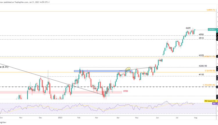 The daily chart helps to assess price action on a more granular level. Price action has consolidated around elevated levels in search for the next bullish catalyst, which could appear in the form of tech earnings, US services PMI data or even NFP data.