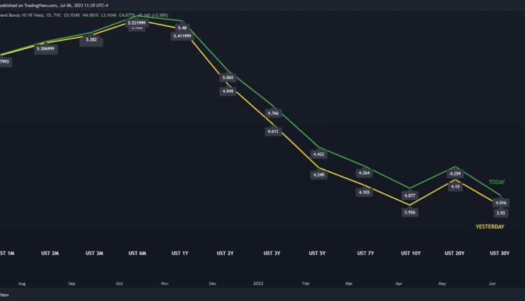 U.S. stocks sold off on Thursday undercut by soaring U.S. yields, which moved sharply higher across the Treasury curve. The 2-year note, for instance, surged past 5.0% and briefly reached its highest level since 2007. Meanwhile, the 10-year bond broke above 4.0%, nearly matching the March high.