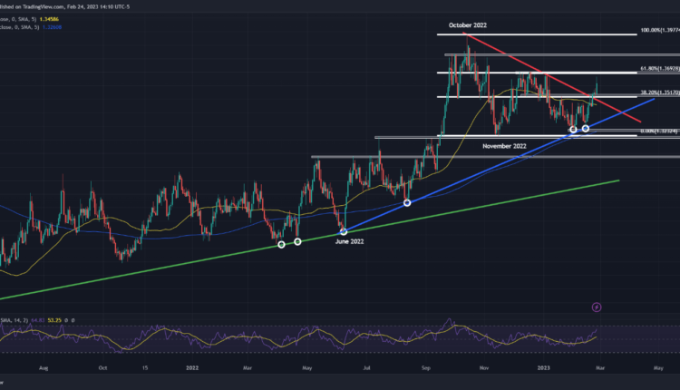 USD/CAD (US dollar – Canadian dollar) has been stuck in a consolidation phase for much of the month, but has finally broken out of its trading range this past week after decisively breaching a key descending trendline extended off the 2022 highs. This bullish breakout has taken the exchange rate to its highest level since the beginning of the year, luring new buyers into the market and creating the right conditions for further gains.